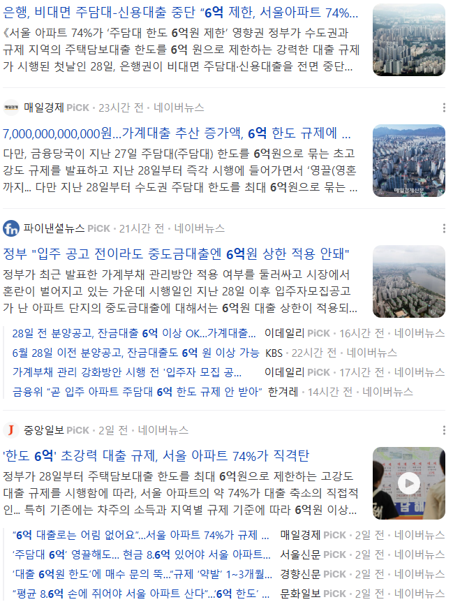 현재 뉴스는 6억 대출 규제로 도배가 되고 있습니다.